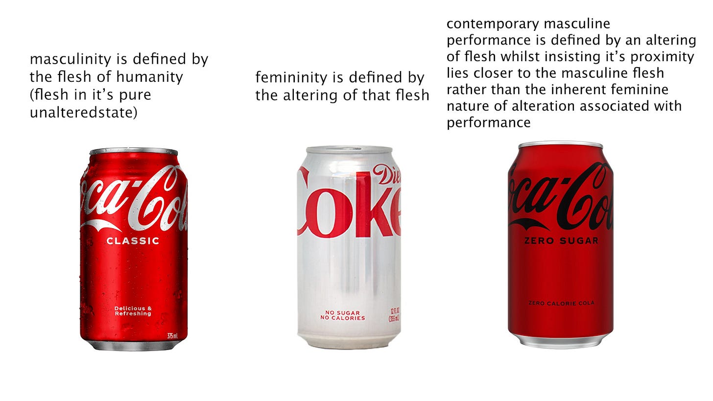 If within modern culture masculinity is defined by the flesh of humanity, and femininity is defined by the altering of that flesh, contemporary masculine performance is defined by an altering of flesh whilst insisting it’s proximity lies closer to the masculine flesh rather than the inherent feminine nature of alteration associated with performance. This is represented by Coco-Cola, Diet Coke, and Coke Zero.