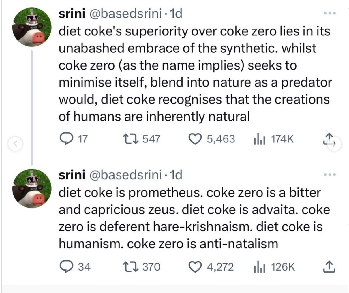 Twitter user basedsrini wrote: “diet coke’s superiority over coke zero lies in it’s unabashes embrace of the synthetic. whilst coke zero (as the name implies) seeks to minimise itself, blend into nature as a predator would, diet coke recognises that the creations of humans are inherently natural.” they continue “diet coke is prometheus. coke zero is a bitter and capricious zeus. Diet coke is advaita. Coke zero is deferent hare-krishnaism. diet coke is humanism. coke zero is anti-natalism”