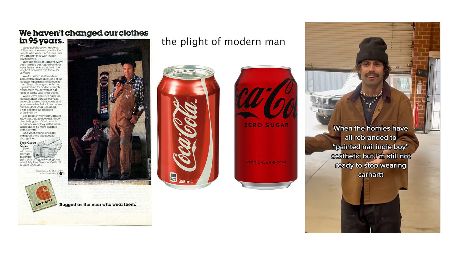 There is a modern phenomenon of men performing masculinity in a way that is inherently “feminine” in nature. Despite the act of performance and the alteration of flesh to be feminine within the current cultural framework, men seek to deny their proximity to the feminine by exaggerating a superficial form of masculinity–whilst denying it’s superficiality. This contemporary masculine performance is represented by Coke Zero. Coca-Cola is the original, the soda at it’s pure unaltered state. Coke Zero is more similar to Diet Coke than it is Coca-Cola. Though, Coke Zero seeks to replicate Coca-Cola whilst denying it’s parallel to Diet Coke. This is exemplified by the decision to change Coke Zero’s name to Coca Cola Zero Sugar in 2017—further distancing it from the Diet Coke branding and aligning itself with Coca-Cola (again—stupid name, no one calls it that, and it’s too long). Coca-Cola represents something classic and Americana that Coke Zero will never be able to replicate despite it’s attempt to simulate it. In this same way Los Angeles, Silver Lake boys dress in Carhartt jackets to perform a version of masculinity they aspire to simulate, but are not and never will be—the blue collar worker.