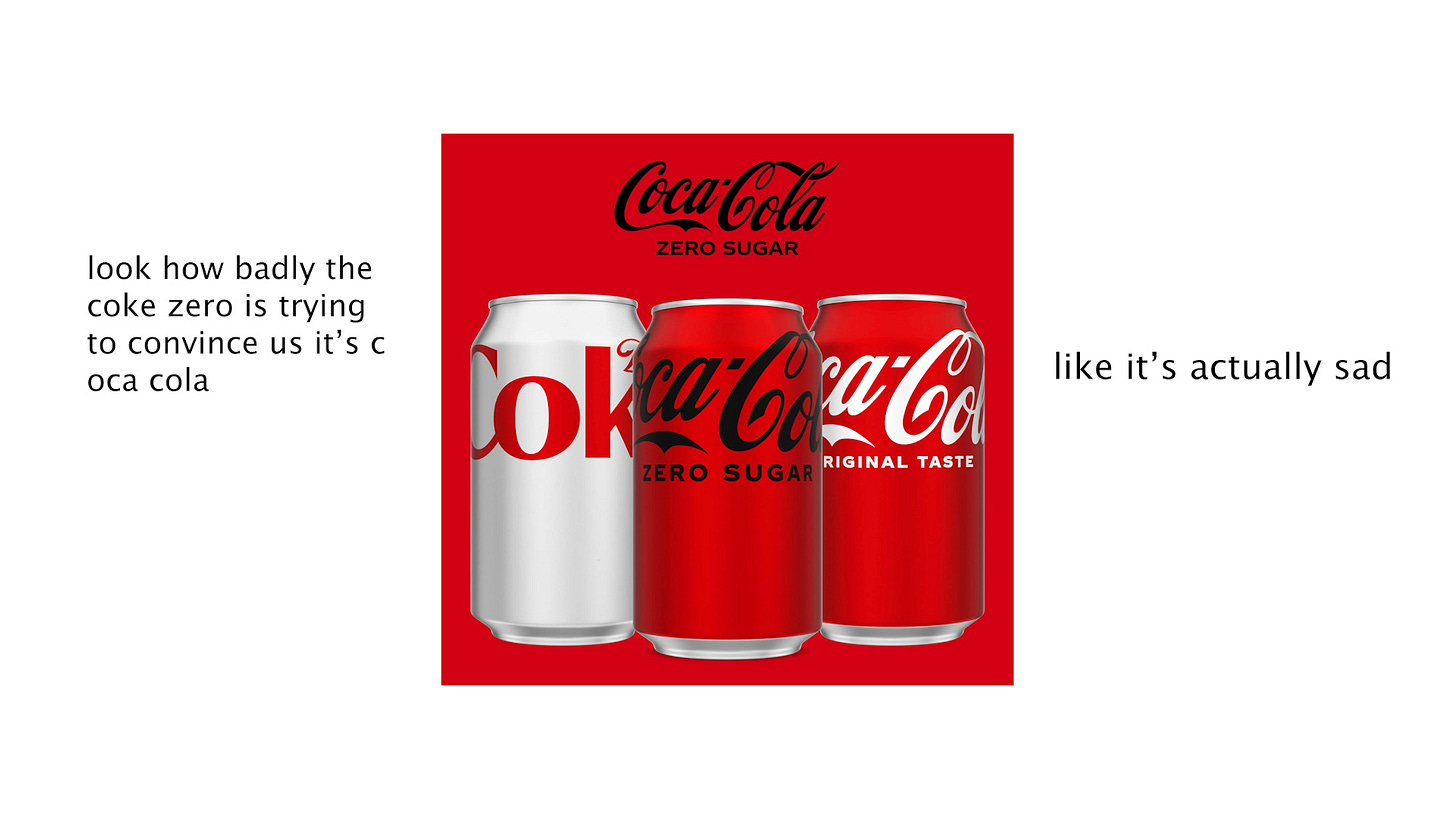 I have said to my boyfriend on multiple occasions in a half-joking tone “Diet Coke is for girls, and Coke Zero is for boys.” As in what Diet Coke vs Coke Zero socially represent within a broader cultural context—their marketing strategies are completely reliant on and echo the performance of contemporary femininity and masculinity.
