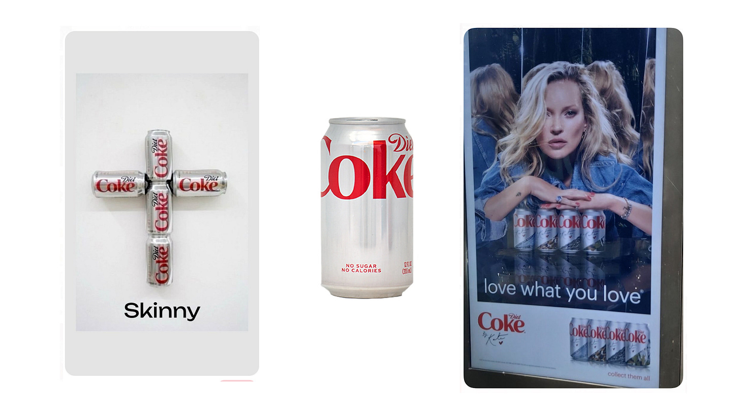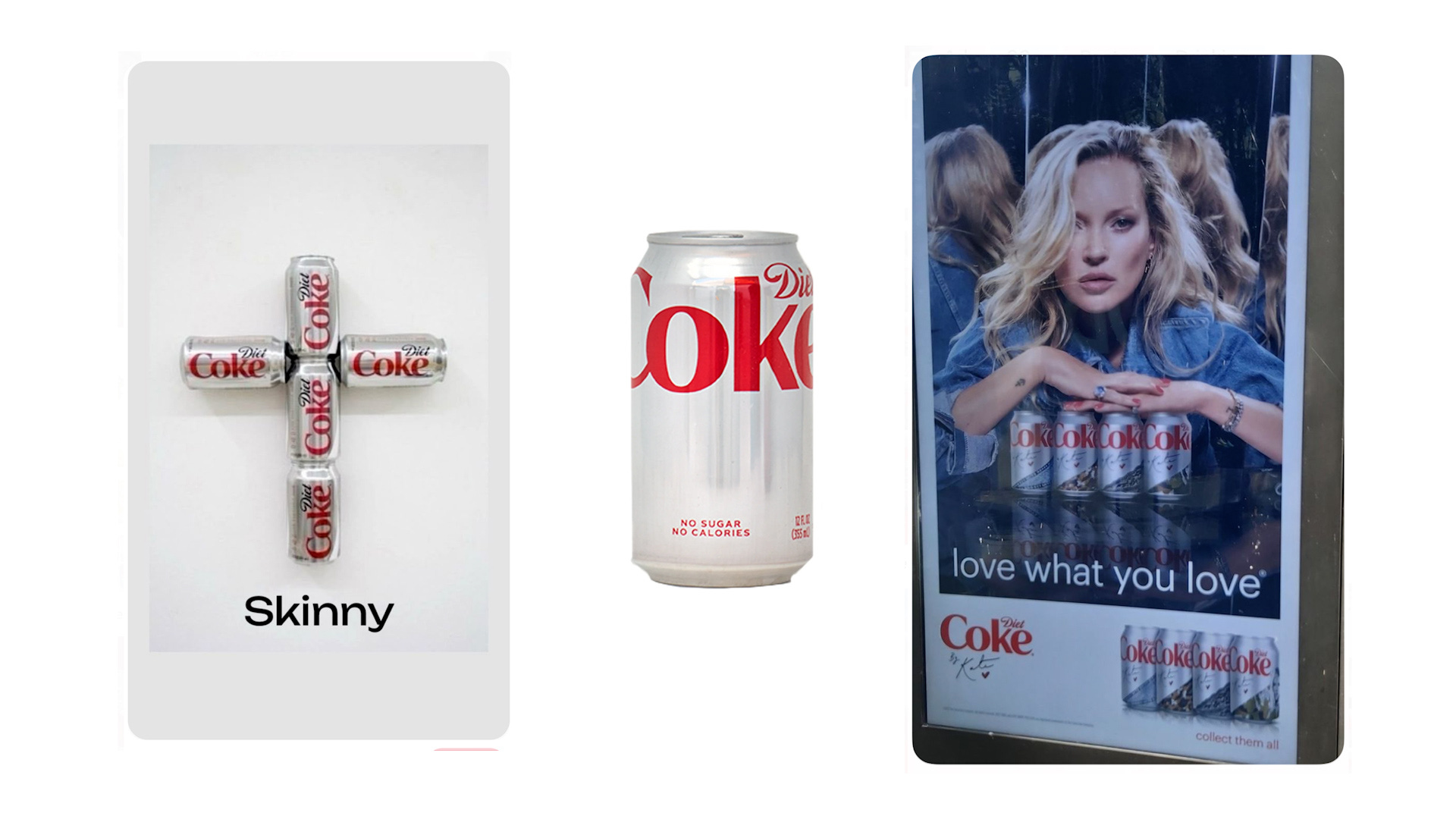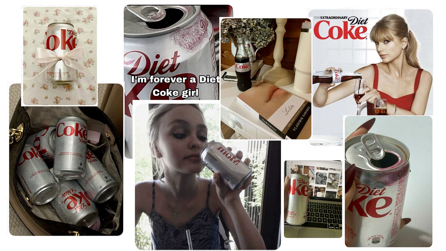 Search “Diet Coke” on Pinterest and you’ll immediately be met with photos of Diet Cokes with other emblems of femininity. Diet Coke can with lipstick stains. Diet Coke being held by a hand with red nail polish. A purse filled to the brim with Diet Cokes. Taylor Swift and Diet Coke. Lily Rose Depp and Diet Coke. Kate Moss and Diet Coke. Diet Coke on a pink bed spread. Diet Coke and ribbons. Diet Coke sat on a bedside table next to a copy of Nabokov’s Lolita. Drink the drink and you too can be a waifish-kate-moss-virgin-suicides-diet-coke-drinking-girl™